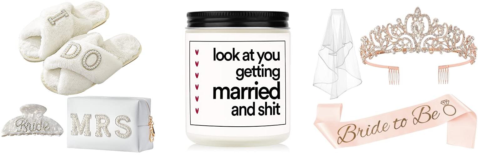 A: Popular gifts include personalized robes, custom tumblers, fun party games, honeymoon essentials, and matching bridal party accessories.