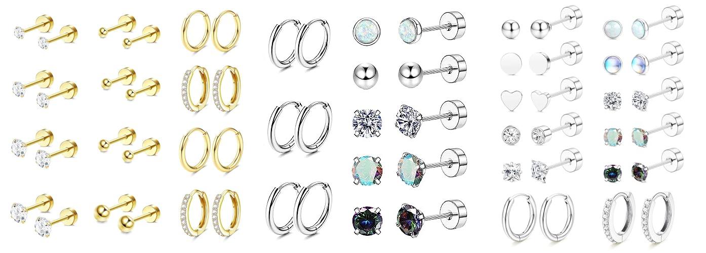 - The set comes with 8 pairs of flat back stud earrings and 4 pairs of hoop earrings, offering plenty of options for multiple piercings like cartilage, helix, and tragus.